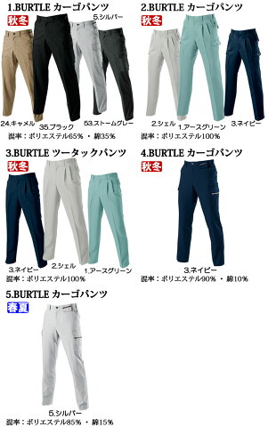 スペック メーカー バートル(BURTLE) シーズン 秋冬物・春夏用 商品名 カーゴパンツ・ツータックパンツ 混率 1.カーゴパンツ(秋冬):ポリエステル65% ・ 綿35% 2.カーゴパンツ(秋冬):ポリエステル100% 3.ツータックパンツ(秋冬):ポリエステル100% 4.カーゴパンツ(秋冬):ポリエステル90% ・ 綿10% 5.カーゴパンツ(春夏):ポリエステル85% ・ 綿15% カラー 1.カーゴパンツ:35.ブラック / 24.キャメル / 5.シルバー / 53.ストームグレー 2.カーゴパンツ:1.アースグリーン / 2.シェル / 3.ネイビー 3.ツータックパンツ:2.シェル / 3.ネイビー / 1.アースグリーン 4.カーゴパンツ:3.ネイビー 5.カーゴパンツ:5.シルバー サイズ 70cm-125cm 加工 ※ご要望の加工は下のバナーをクリックしてお求めくださいませ。